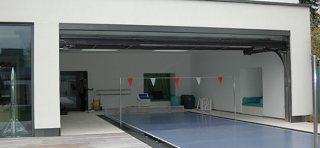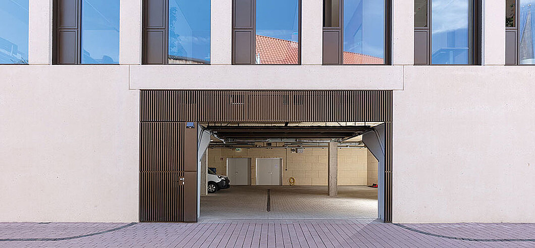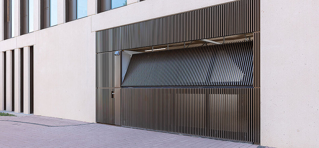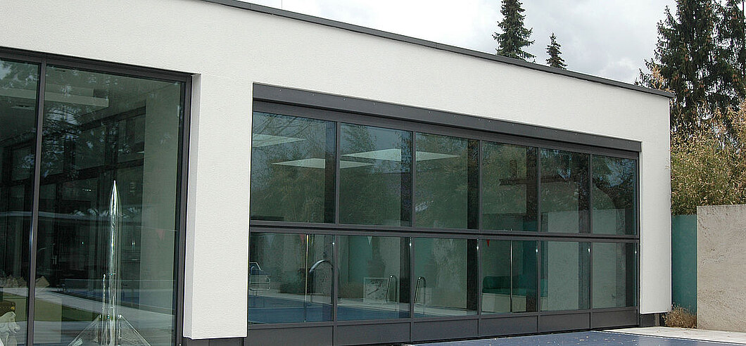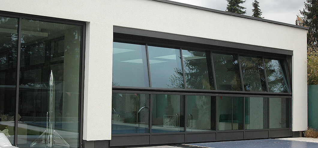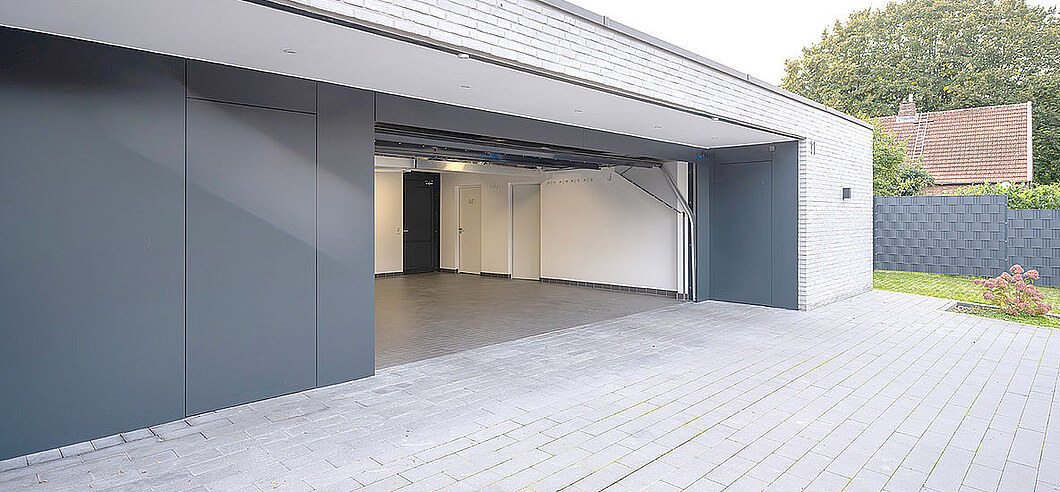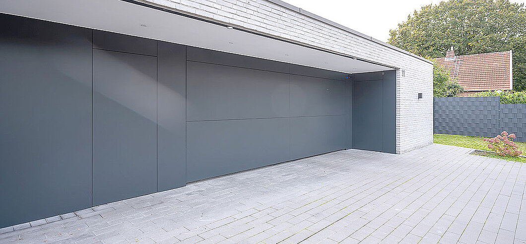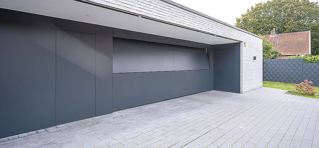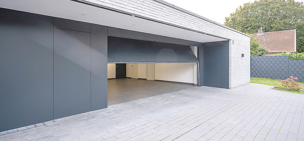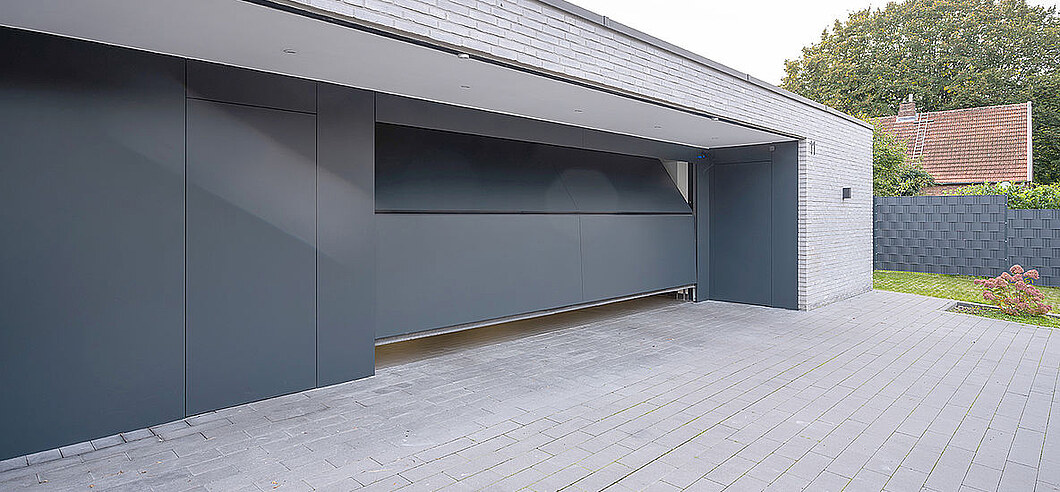 Ohne Sturzblende ermöglicht diese Konstruktion eine besonders geradlinige Optik, die z.B. durch eine vertikale Beplankung noch verstärkt wird. Das Tor fährt also direkt unter die Decke, keine weiteren Übergänge und keine zusätzlichen Fugen stören das Erscheinungsbild. Cleaner geht’s nicht.