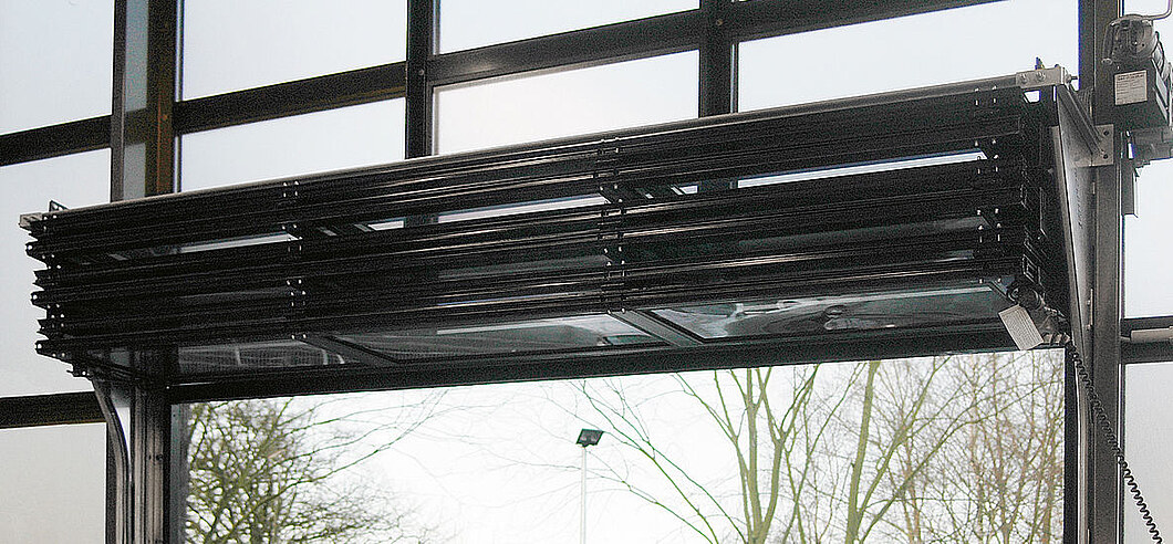 Bereits mit einer Bautiefe von nur 45 mm lassen sich Deckenfalttore in beeindruckenden Größen realisieren: