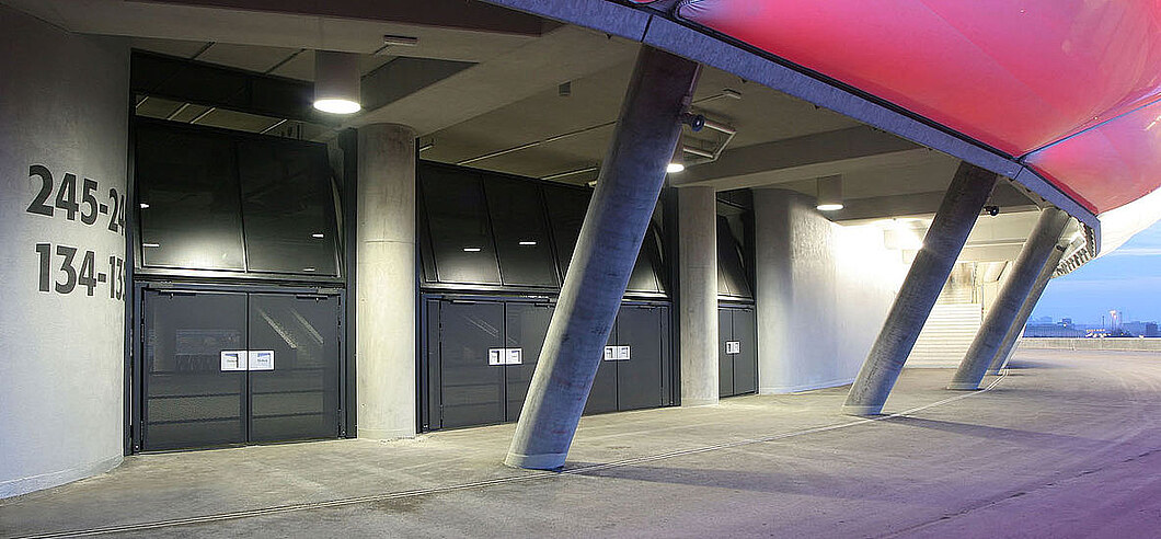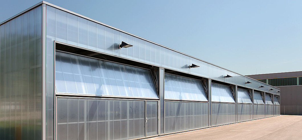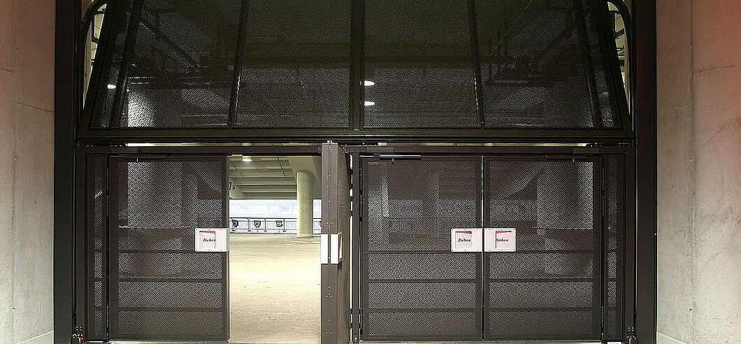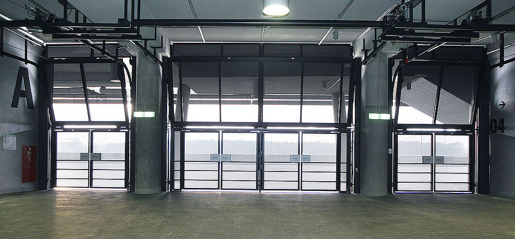 Dies ermöglicht eine hohe Energieersparnis, besonders im Winter. Wird das komplette Tor geöffnet, dient es als Ein- und Ausgang zur Industriehalle und kann beispielsweise von Gabelstaplern oder ähnlichen Arbeitsgeräten durchfahren werden.
